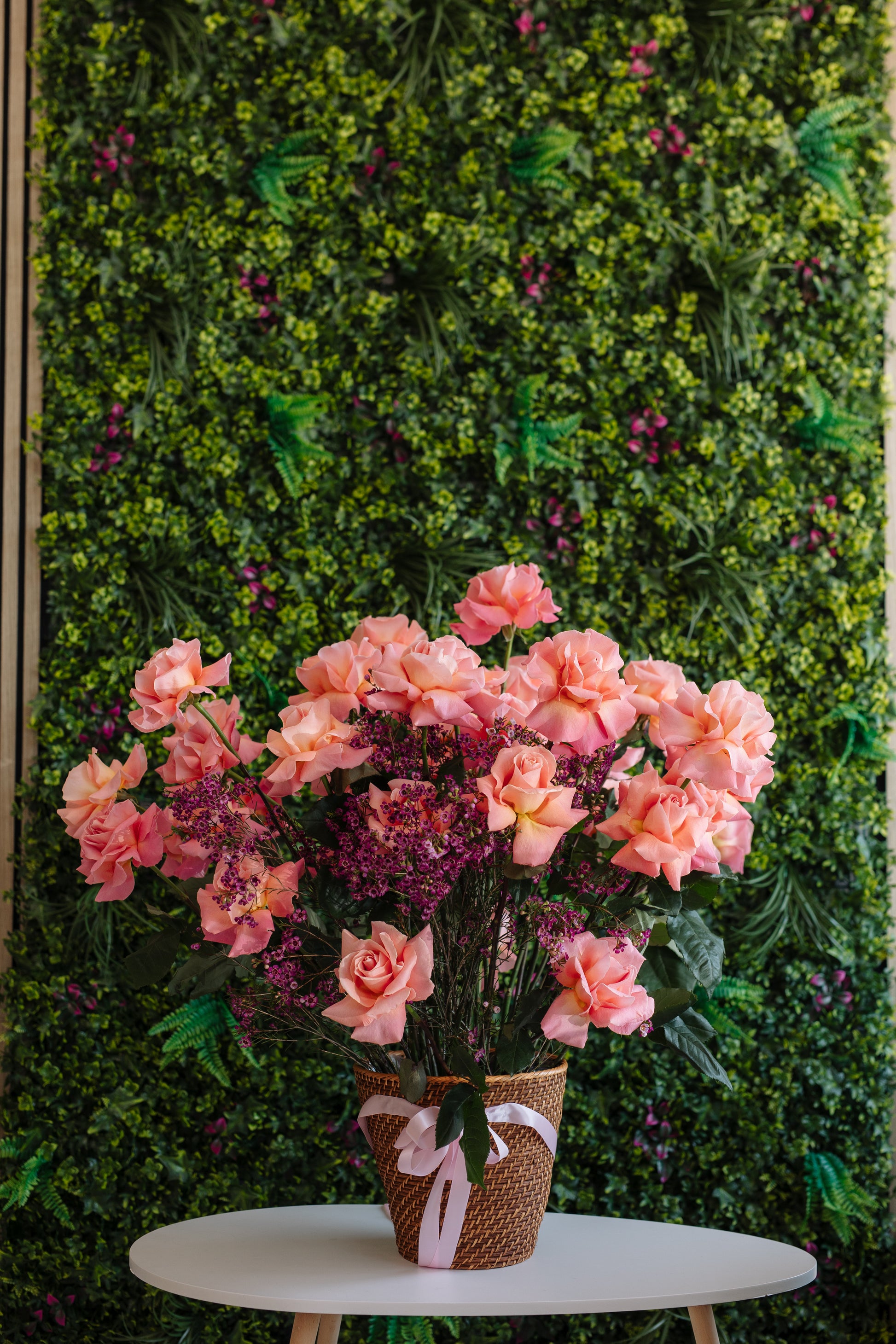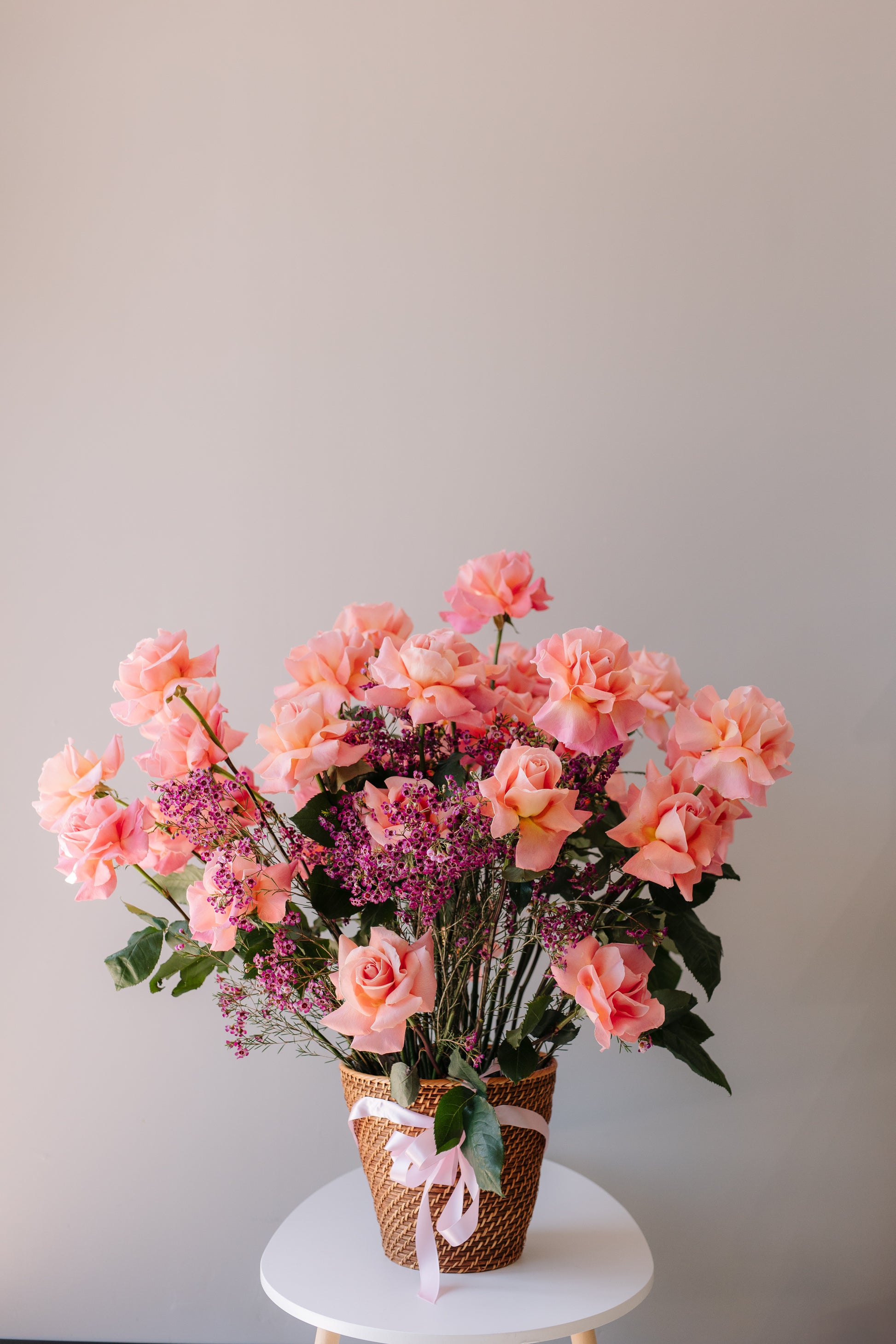 Indulge in the beauty of a Sunset Basket filled with gorgeous, dreamy French style roses in a peachy pink hue. Transport yourself to a romantic paradise with this stunning arrangement that will add a touch of elegance to any space. Experience the joy and wonder of a breathtaking sunset every day with our Sunset Basket.